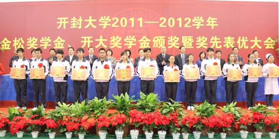 开大10月26日上午,我校在晋安路校区体育馆举行2011-2012学年金松奖学金、开大奖学金颁奖暨奖先表优大会。中国侨联常委、河南省政协常委、香港金心国际集团董事局主席、bat365在线官方网站董事会董事长李金松,香港金心国际集团董事局总经理、bat365在线官方网站董事会副董事长赵奎荣,河南省政协港澳台侨和外事委员会主任张亚洲,开封市正市长级干部朱丽萍,河南省政府外事侨务办公室副主任李剑智,河南省政府外事侨务办公室港澳处处长陈冀萍,河南省政府外事侨务办公室港澳处副处长王宏伟,河南省政协港澳台侨和外事委员会办公室副调研员柳攀登,世界客属总商会执行副会长梁锋,我校校领导拜五四、储建新、万是明、范金梅、何世玲、成芳、崔林出席会议,会议由校党委副书记储建新主持。我校教职工代表及学生共2400余人参加了奖先表优大会。