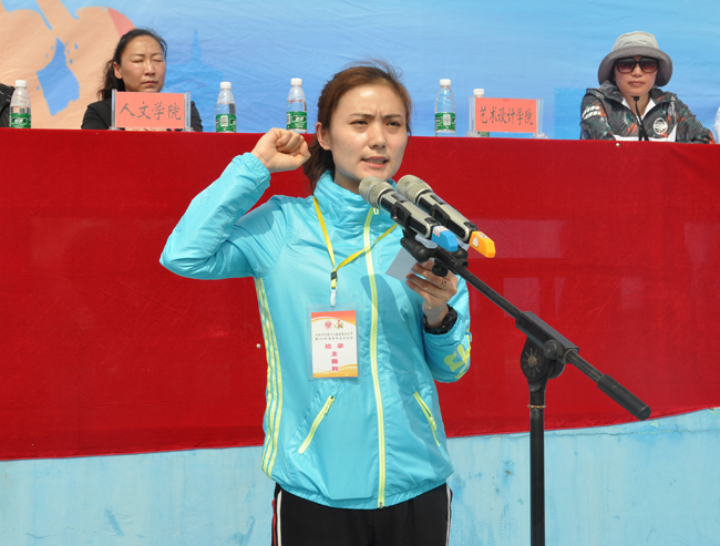 体育教研部教师牛文娜、2016年和2017年中国大学生跆拳道锦标赛品势冠军张昕同学分别代表全体参赛裁判员、运动员宣誓。