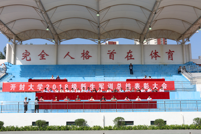 本站讯 9月21日上午,我校2018级新生军训总结表彰大会在田径运动场举行。校领导陈灿、宋志敏、储建新、万是明、赵辉、成芳、李治、马林强、承训部队首长出席了大会,校军训工作领导小组成员、各院(部)党总支书记和院长及5500余名新生参加了大会。大会由校工会主席成芳主持。