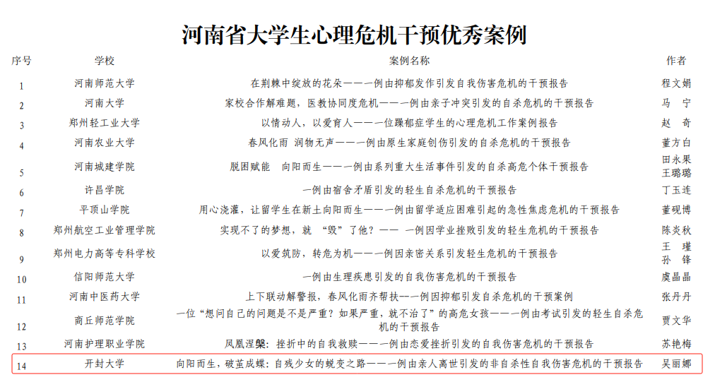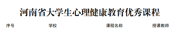 其中,师彦洁老师申报的《大学生心理健康教育》获评河南省大学生心理健康教育优秀课程;吴丽娜老师和师彦洁老师申报的大学生心理危机干预案例获评优秀案例。