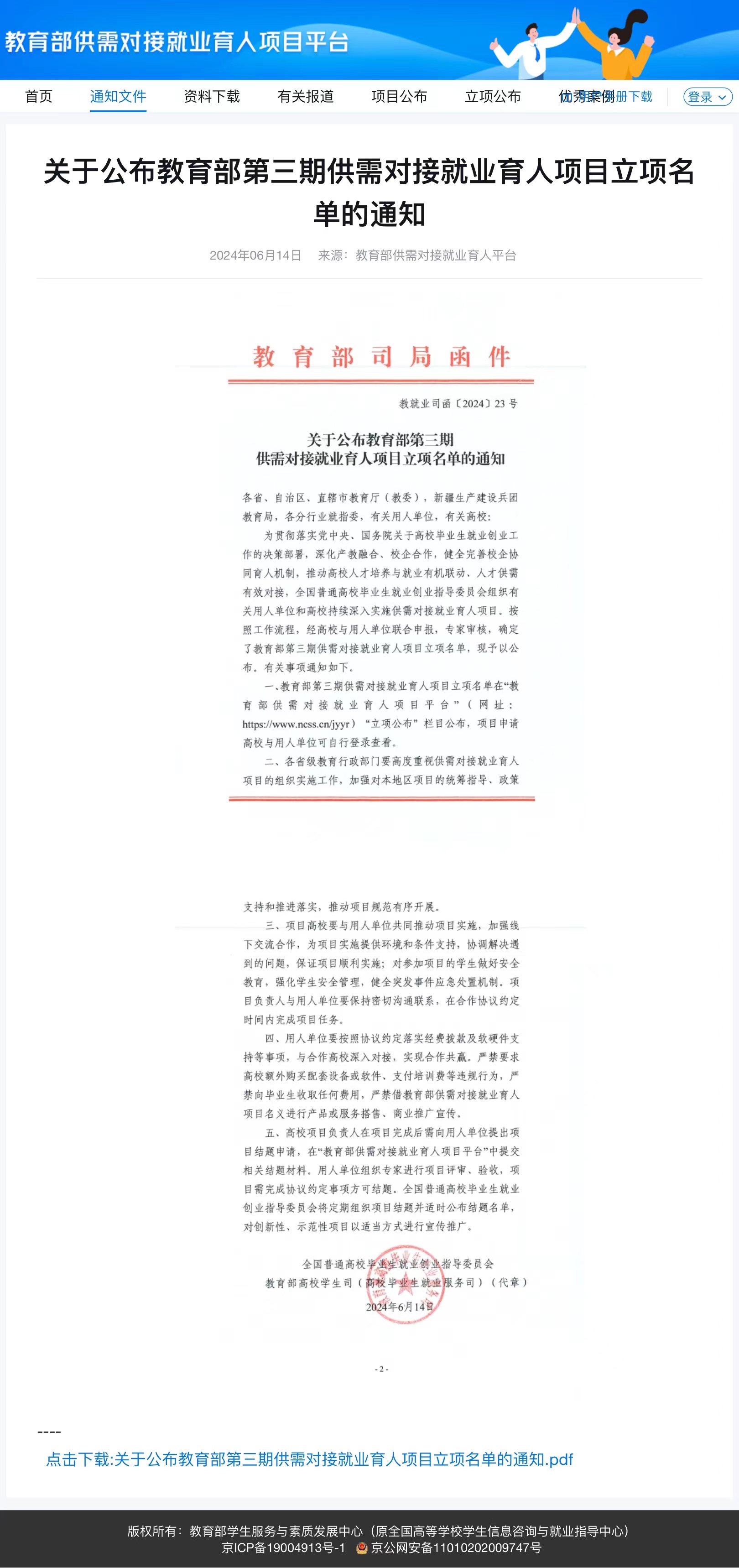 教育部高校学生司供需对接就业育人项目是由教育部高校学生司组织有关用人单位和高校共同实施,是持续深入落实党中央、国务院就业创业决策部署,深化产教融合、校企合作,健全完善校企协同育人机制,推动人才培养与就业有机联动、人才供需有效对接的重要举措。