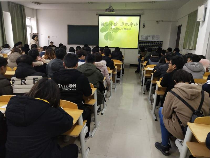 本站讯 期末考试即将开始,为严肃考风考纪,加强诚信教育,同时在寒假假期即将来临时对学生进行必要的安全教育,12月24日晚6点半时,我院18级全体学生于3号楼四楼教室召开了考风考纪暨假期安全教育主题班会,会议由张娜娜老师主持。
