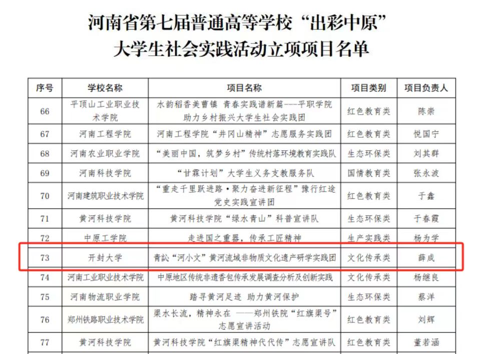 近日,河南省教育厅发布《关于第七届普通高等学校“出彩中原”大学生社会实践活动项目立项结果的公示》,我校信息工程学院“青訫‘河小文’黄河流域非物质文化遗产研学实践团”项目获得立项,该项目由校团委薛成老师为项目负责人,信息工程学院辅导员高俊笑、贺钰为指导老师。