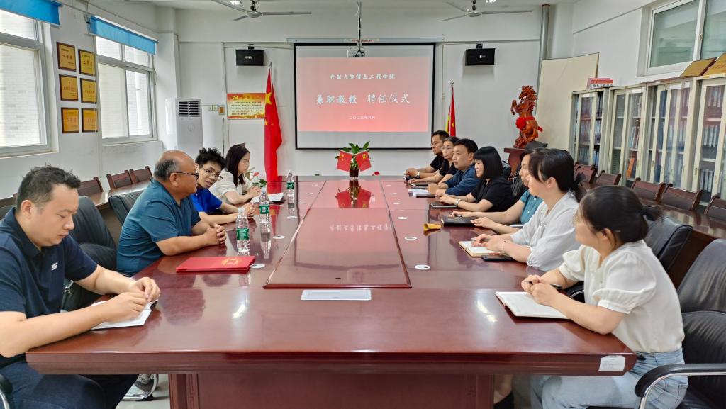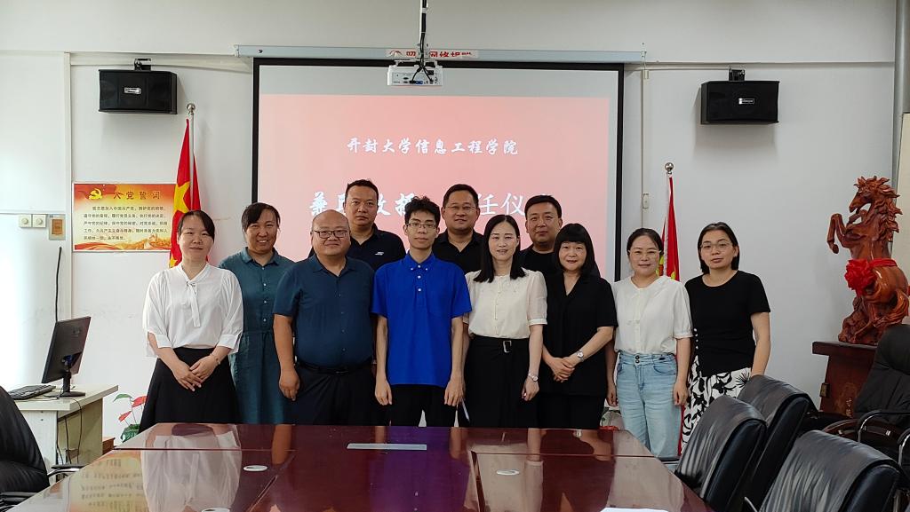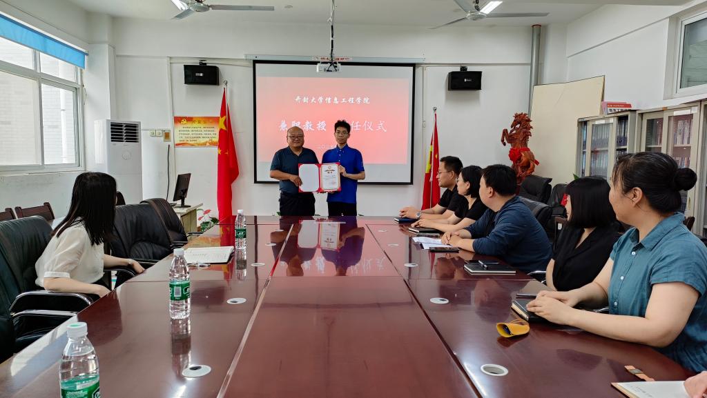 本站讯 6月27日下午,bat365在线官方网站信息工程学院在三号楼三楼会议室隆重举行兼职教授聘任仪式,正式聘请南开大学人工智能学院黎建宇教授担任学院兼职教授。信息工程学院党总支书记武莹、院长张新成及全体领导班子成员、各教研室主任共同出席了仪式。