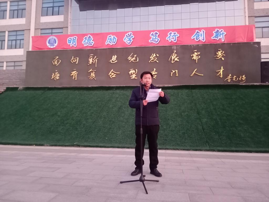 学院党总支副书记高剑南代表学院领导班子讲话。高老师勉励同学们要做身体心理健康、思想道德高尚、掌握专业文化素养、劳动技能和创新发展五个方面的模范。要胸有大志,不断充实自己,认识自己,努力做一个有志向、有上进心的人。