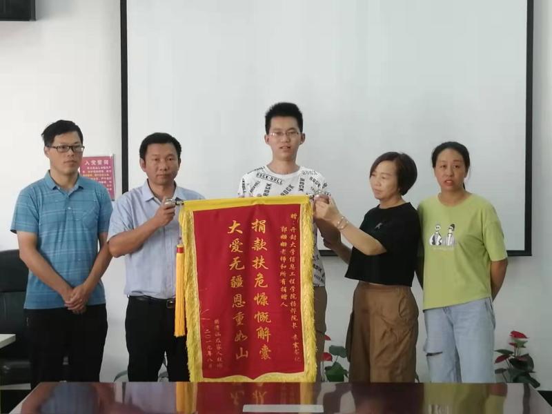 本站讯 9月1日上午,信息工程学院2018级学生樊萧涵的家人满怀感恩之心,向学院赠送“大爱扶危,恩重如山”锦旗,以此感谢全院师生对孩子无私的关爱与帮助。