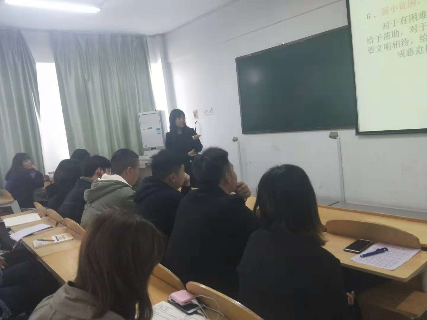 此次班会由辅导员王沐昕老师主持。班会首先以学生自导自演的短剧开始,从丢手机这件发生在学生身边的事情引入。接着,王老师给大家讲解了诚实守信和文明礼仪的主要概念和要求,通过典故和现实中的例子告诉大家要信守承诺,重视自己的“信用值”;同时王老师还通过校园中的不文明现象向同学们阐释了如何做一个文明礼貌的大学生以及文明礼仪的重要性,并多次强调在今后的生活中要诚信待人,文明礼貌,尊师重道。
