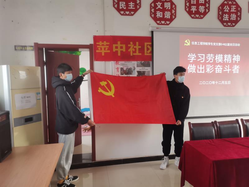 本站讯 在社会各届热议习近平总书记在《全国劳动模范和先进工作者表彰大会上的讲话》;第三十四个国际志愿者日;全校上下深入学习贯彻市委侯书记党的十九届五中全会精神暨《读懂开封城 争做出彩开封人》思政课精神之际。信息工程学院与顺河回族区团委、顺河回族区苹果园办事处联合开展“学习劳模精神 做出彩奋斗者”5+N主题党日活动暨国际志愿者日志愿服务活动。顺河回族区团委书记武昕、顺河回族区苹果园办事处副主任王玉红与信息工程学院学生党支部全体师生一同参加了主题党日活动,并在主题党日活动后与学院党员师生、青年志愿者协会志愿者们一起参加了志愿服务活动。