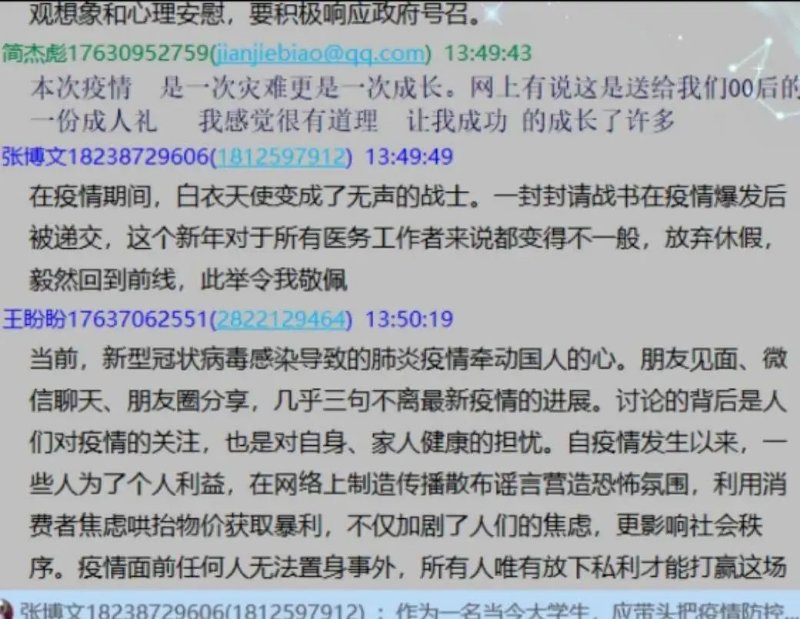 在各班开展的团会中,学院各个团支部重温了习近平总书记《在统筹推进新冠肺炎疫情防控和经济社会发展工作部署会议》和《携手抗疫 共克时艰——在二十国集团领导人特别峰会上的发言》等系列讲话。深入学习了解了全国各条战线和各族人民在以习近平同志为核心的党中央坚强正确领导下,打赢防疫防控阻击战的艰辛历程。是团员青年和青年学生们明白了,新中国成立以来,虽历经种种磨难,但从来没有被压垮过,而是愈挫愈勇,不断在磨难中成长、从磨难中奋起。这一切都来源与党中央的坚强领导;中国特色社会主义制度的显著优势;国家强大的动员能力和雄厚的综合实力;全党全军全国各族人民的团结奋斗。