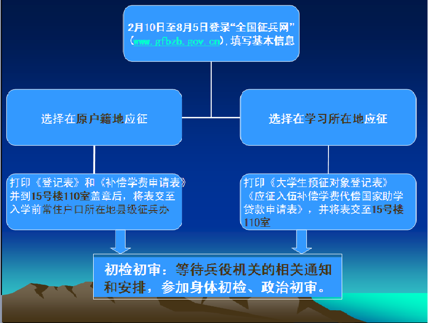 1.网上报名:登录“全国征兵网”(网址:http://www.gfbzb.gov.cn)填写基本信息报名。(关于“应征地”,普通高校应届毕业生和在校生既可选择在学校所在地,也可选择入学前的常住户口所在地)