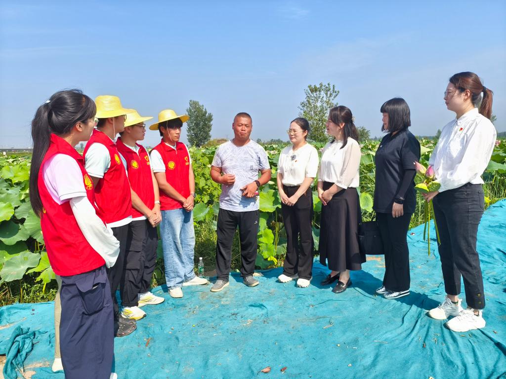在助农乡村振兴社会实践活动中,实践队走进双河铺社区,实地体验了水稻种植、小龙虾养殖等农田劳作,并与社区干部座谈,了解农业现代化进展;在团顺河回族区委支持下,赴土柏岗街道大杜寨社区学习荷花种植经验,体验莲子采摘;学院副院长王晓婷、数学教研部主任赵展、“青雪苗圃辅导员工作室”成员雷文杰在千亩荷塘旁为同学们讲授了一堂生动的乡村振兴主题微党课,鼓舞大家以更加昂扬的青春激情学好专业知识,积极投身到乡村振兴事业中去。
