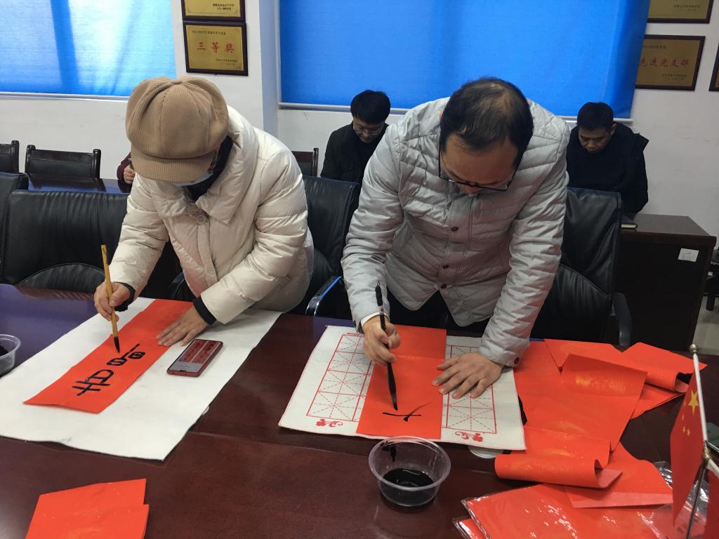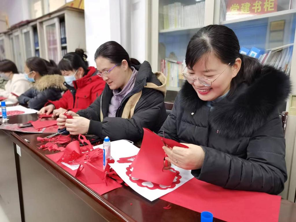 最后一个环节为“写春联,剪窗花,迎新春”。整个会场热闹非凡,一边是陈丽老师、王娟老师和梁宏老师尽情挥毫泼墨,一副副妙笔成双的春联展现在眼前。另一边,随着剪刀和红纸在老师们的手中灵活翻飞,造型各异的窗花、喜字就跃然纸上,大家无不拍手称赞。