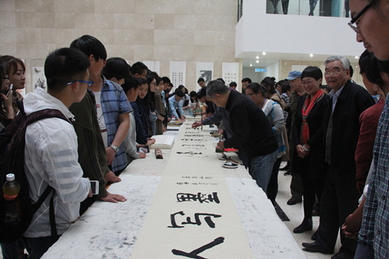 为营造浓厚的书香校园氛围,传承中华文化。5月14日下午,我校联合城摞城书画院和我校书协共同举办书画名家进校园活动。著名作家、学者、书法家、原开封市委宣传部副部长屈春山、中国美术家画院院士刘锴明、河南省书画协会会员赵广福、陈天福、河南省书法家协会会员张锁平受邀出席了活动,我校党委宣传部、图书馆的负责人、我校书画协会指导教师毛成利及200余名书画协会会员参加了活动。