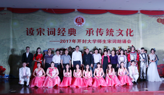 本站讯 5月18日,我校在行政楼一楼报告厅举行了“读宋词经典、承传统文化”大型师生宋词朗诵会。此次活动由我校工会、党委宣传部、人文学院共同举办。开封市总工会副主席戴国胜、开封市总工会文教卫工会主任李汴军、河南工会日报开封记者站站长刘长征,我校校领导储建新、成芳、李治出席了朗诵会,校党委宣传部、人文学院、学报编辑部和各分工会负责人以及师生代表参加了朗诵会。