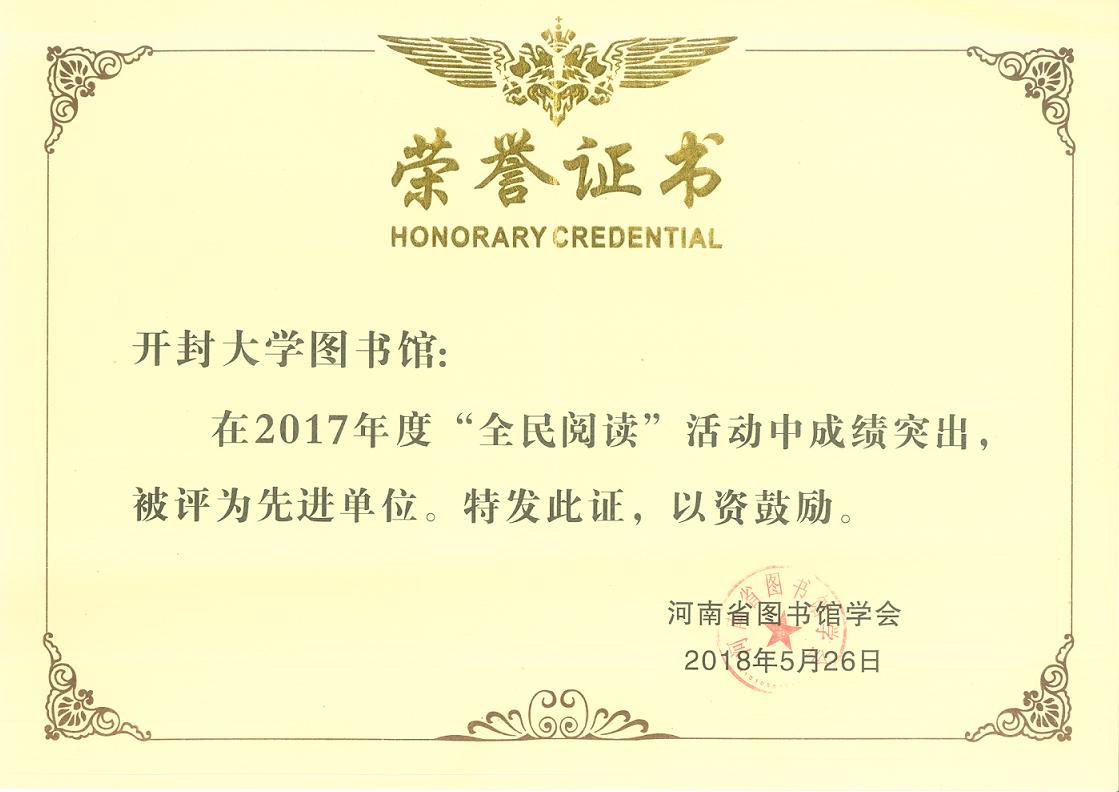 本站讯 近日,河南省图书馆学会九届五次全体理事会在郑州召开,会议对2017年度全省各系统图书馆在开展全民阅读活动中取得显著成绩的单位进行表彰。我校图书馆荣获2017年度河南省全民阅读先进单位,副馆长许建萍荣获2017年度河南省全民阅读先进个人。