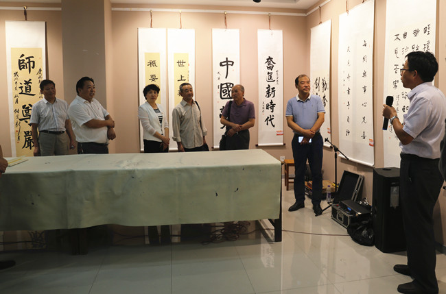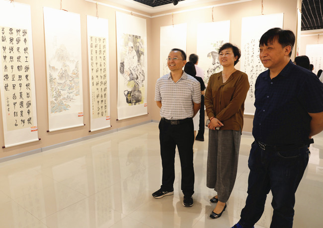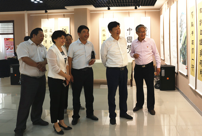本站讯 为隆重庆祝新中国成立70周年, 9月29日上午,由我校工会主办、校书画协会协办、艺术设计学院承办的“不忘初心,牢记使命”主题教育书画展开幕式在艺术设计学院二楼东展厅举行。开封市金明书画院姬义海院长、黄河水利职业技术学院宗致远教授,校领导陈灿、宋志敏、储建新、赵辉、成芳、李治、马林强出席了开幕式,党委组织统战部、校工会、艺术设计学院负责人参加并观看了画展。