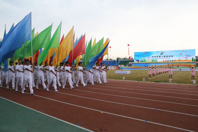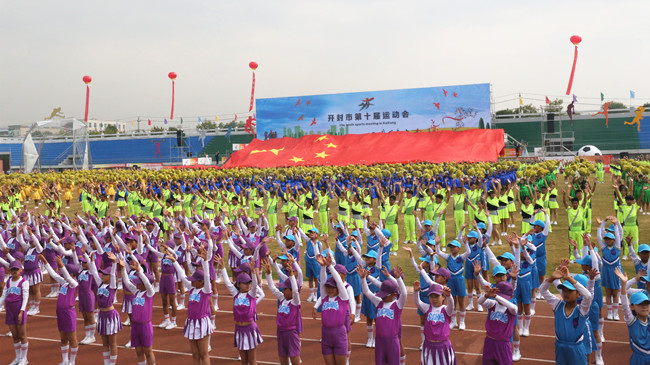 本站讯 9月26日上午,开封市第十届运动会在开封市华北体育场盛大开幕,这是我市在迎接中华人民共和国成立70周年之际举办的一次综合性体育盛会。我校党委书记陈灿,校长宋志敏,党委副书记储建新,工会主席成芳出席开幕式,校团委、体育部、机械与汽车工程学院、财政经济学院、医学部、国际教育学院部门教师参加。我校近千名学生承担“十运会”开幕式迎宾礼仪、花束队、彩旗队、引导员、志愿服务以及大型文体表演《开封你好》第一场《活力开封》和第四场《我和祖国》的演出任务。