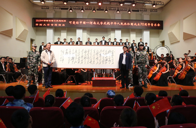 音乐会开始前,校党委副书记储建新致辞,并向河南大学音乐学院赠送了我校教师书写的书法作品《沁园春•雪》。