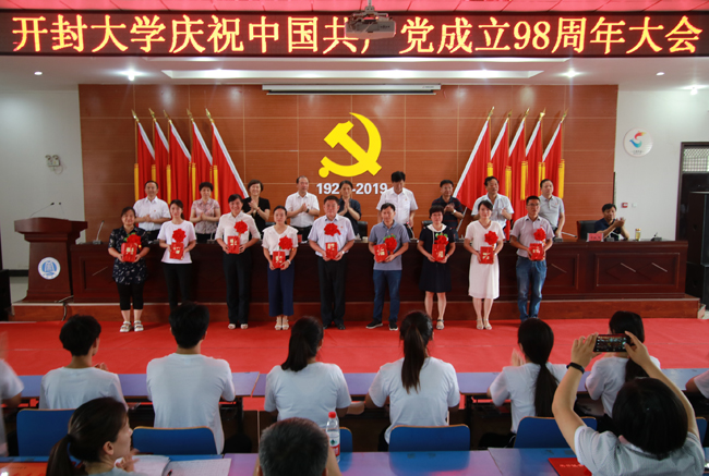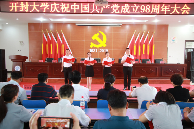 党委组织统战部部长赵海胜带领老党员重温入党誓词、新党员宣誓。继续教育学院院长、教工党支部书记葛华,材料与化学工程学院辅导员、学生党支部书记陈彦霏分别代表优秀党务工作者和优秀共产党员进行了发言,他们都表示要加强自身学习,不忘初心,牢记使命,立足本职工作,发挥先锋模范作用,凝心聚力,团结拼搏,做合格的人民教师,做优秀共产党员。