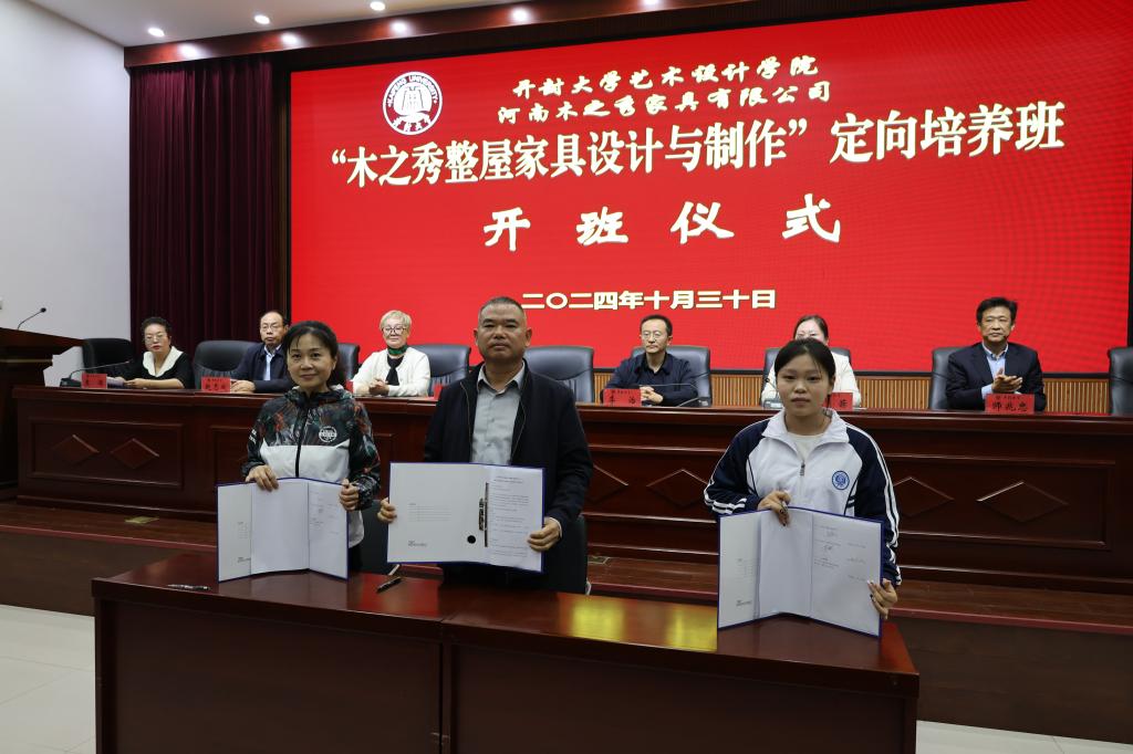 10月30日,bat365在线官方网站艺术设计学院与木之秀整屋家具设计与制作公司订单班开班仪式在行政楼第一会议厅举行。副校长李治、教务处处长王茜、产教融合服务中心主任师兆忠、河南木之秀家具有限公司董事长李鹏、总经理江霞、设计总监李萍、艺术设计学院党总支书记赵志成、院长张富云,环境艺术设计专业教师和全体环艺学生参加开班仪式,仪式由艺术设计学院副院长袁颖主持。
