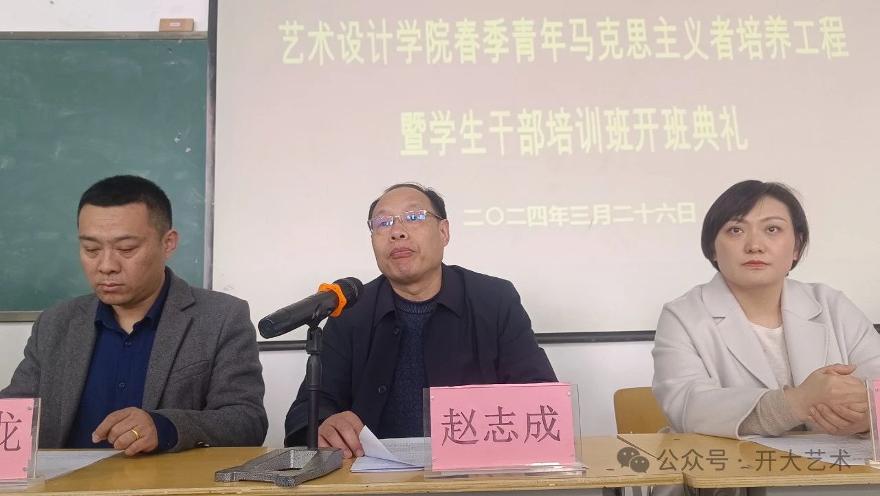 本站讯,为深入贯彻党的二十大精神、习近平新时代中国特色社会主义思想及两会精神。3月26日下午,在艺术设计学院15号楼519教室,艺术设计学院青年马克思主义者培养工程暨学生干部培训班开班。艺术设计学院党总支书记赵志成、共青团bat365在线官方网站委员会副书记李卓珊、党总支副书记王龙、辅导员任海东、王妍、李恩广和90名学员参加本次开班仪式,开班仪式由团总支书记孙巳尧主持。