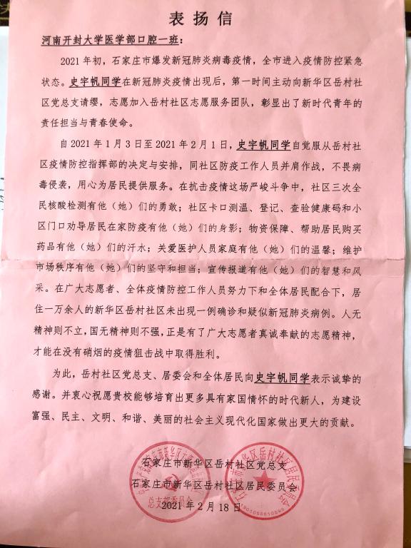 这封有爱、有温度、又有着中国青年责任和担当的感谢信在学生群体中广泛传阅,许多熟悉史宇帆的老师和同学们都非常感动,这不仅仅是石家庄市新华区岳村社区居民委员会对志愿者们夜以继日、加班加点工作的肯定,而且彰显了青年一代在这场战“疫”中不忘初心,砥砺前行的决心,更充分反映了医学部“立德树人”的成果。