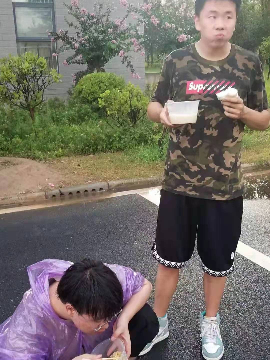陶治名同学在雨中与同学一起席地就餐,任劳任怨