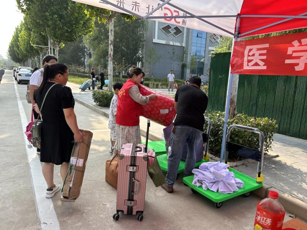 今年,为了让新生感受到新家浓浓的人文关怀,医学部继续完善迎新服务,设立以“贴心、便捷”为核心的迎新工作理念,全体教职员工及志愿者们等全流程跟进新生报到。贴心在院部内设立“绿色通道”,及时解决家庭经济困难学生急、难、愁等问题;贴心在新生报到点外设置了“家长休息区”,配备帐篷、凳子、饮用水,为家长们营造舒心的休息环境;贴心值守在学校南、北大门设立行李运输调度站,一位位身穿红色马甲的志愿者拉着手推车,随时做好为新生运送行李的服务准备。