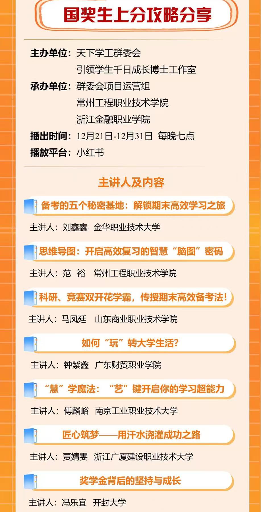 2024年12月21日,冯乐宜受邀参与全国高职学生工作网络联盟开展的【期末备考干货·国奖生上分攻略】活动,客座小红书直播为广大学子分享经验,传递榜样力量。