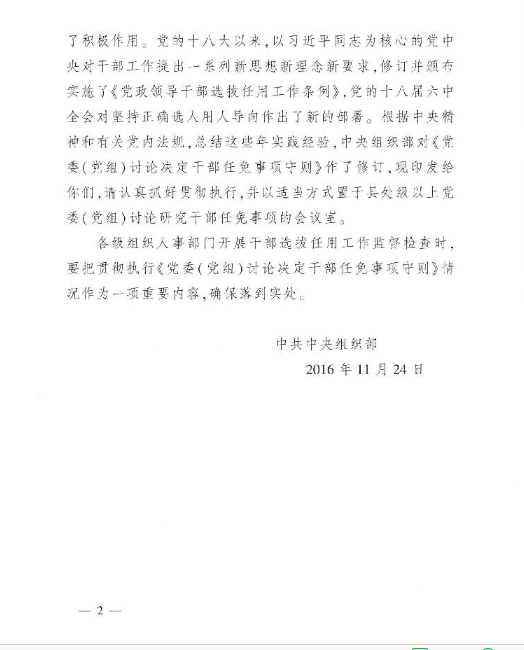 2.坚持党管干部原则,认真贯彻民主集中制,强化党委(党组)的领导和把关作用。严格执行干部选拔任用工作程序,没有按规定进行酝酿动议、民主推荐、组织考察的不上会,没有按规定核实清楚有关问题的不上会,没有按规定向上级报告或报告后未经批复同意的干部任免事项不上会。