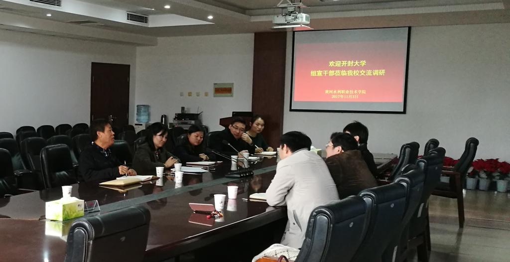 上,黄河水利职业技术学院组织部长谷献晖致欢迎辞。家共同观看了该校的宣传片,接下来组织宣传对口部门分别深入交流。黄河水利职业技术学院组织部长谷献晖介绍了学校的党建工作、干部的选拔以及“十九大”精神学习贯彻落实等情况。bat365在线官方网站组织部长秦雪峰对该校的热情接待表示衷心感谢,同时希望双方今后继续开展深入交流、密切合作。