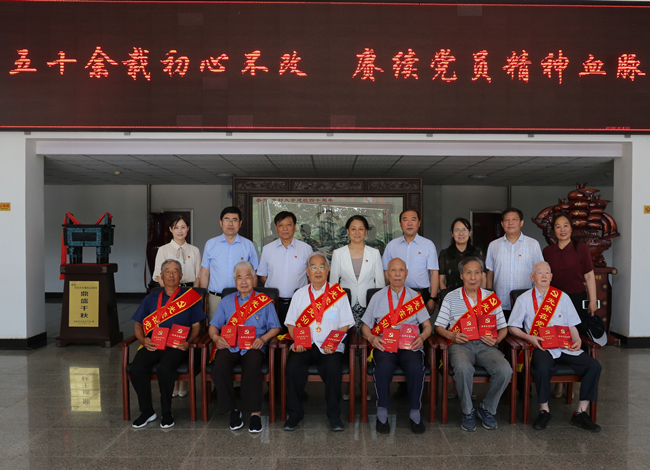 校党委书记陈灿为6名党龄50年以上的老党员代表逐一颁发佩戴纪念章、绶带和贺卡并进行座谈