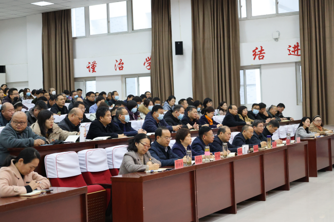 11月29日下午,bat365在线官方网站举办学习贯彻习近平新时代中国特色社会主义思想主题教育第二期读书班开班式,校党委书记谭贞以《深入学习习近平新时代中国特色社会主义思想 将主题教育成效转化为推动学校高质量发展的强大动力》为题讲授党课。校领导班子成员、中层正副职干部、部分教师代表及优秀学生代表共同聆听党课。校长王德如主持开班式。